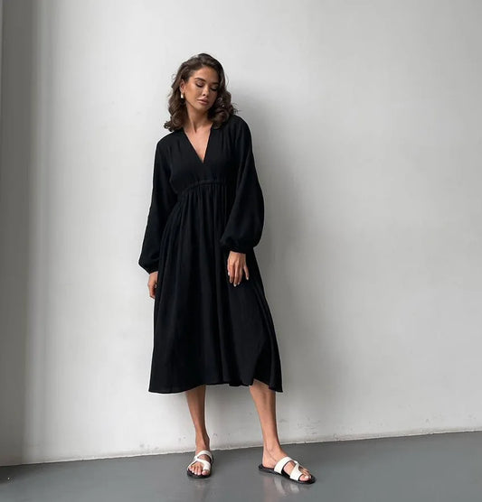 Dresses Length : Midi Fabric Type : cotton Material : 100% Cotton Neckline : V-neck Pattern Type : Solid Sleeve Style : Long Sleeve Style : sweet, Casual, STREETWEAR, Bohemian, Normcore/Minimalist, BASICS, Modest, Romantic, sexy, Vacation, ELEGANT Waistline : Natural Occasion : Daily Season : Winter, Summer, Spring, Autumn Feature : Breathable, Washable Decoration : None Supply Type : In-Stock Items Fabric Weight : grams Logo position : as requested Needle detection : No Printing Methods : plain Technics : GARMENT DYED Weaving method : Woven Silhouette : A-Line Sleeve Length : Full Lining : Polyester Pockets : No Fit : Slim Hem Shape : Straight