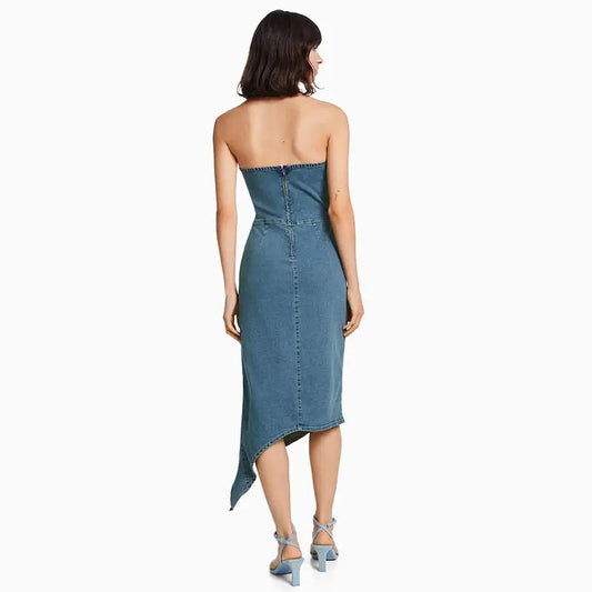 Asymmetrical Strapless Pleated Denim Midi Dress for Women