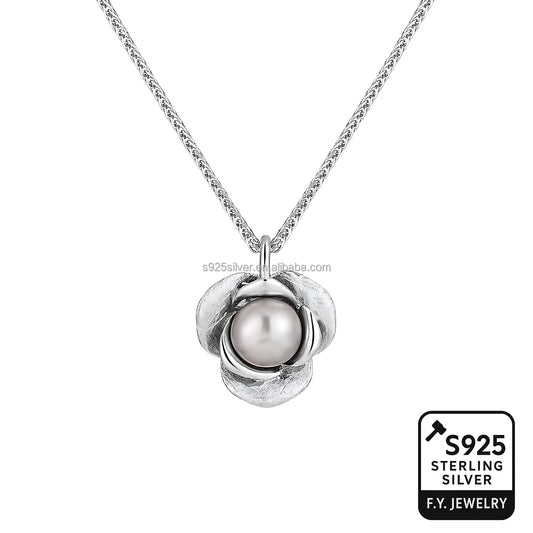 Stylish High Quality Fancy Jewelry 925 Sterling Silver Round Freshwater Pearl Rose Flower Pendant Necklace