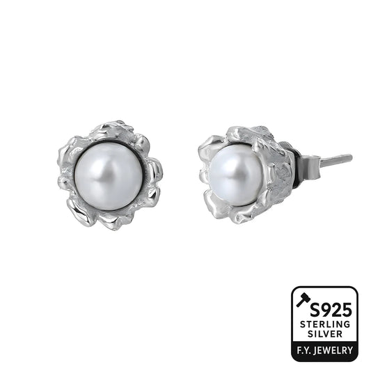 925 Sterling Silver Irregular Pearl Flower Stud Earrings
