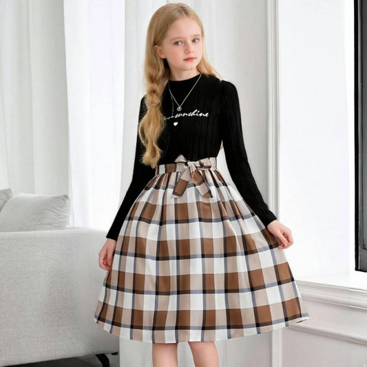 Wholesale Boutique High Quality Cotton Girls Dress - Long Sleeves Black Top with Plaid Skirt