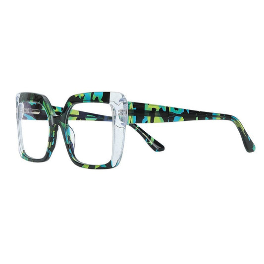 MCROONS glasses feature a chunky rectangular design with a striking teal and black marbled pattern. The warm brown-tinted lenses provide a cozy contrast, enhancing comfort and style. Perfect for those looking to add a bold touch to their wardrobe, these glasses seamlessly blend trendy aesthetics with functional design, making them ideal for both casual and upscale events.