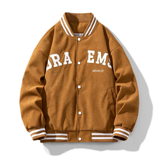 Iconic Design: Features varsity-style lettering and stripes on the collar and cuffs, bringing a sporty vibe to your outfit.